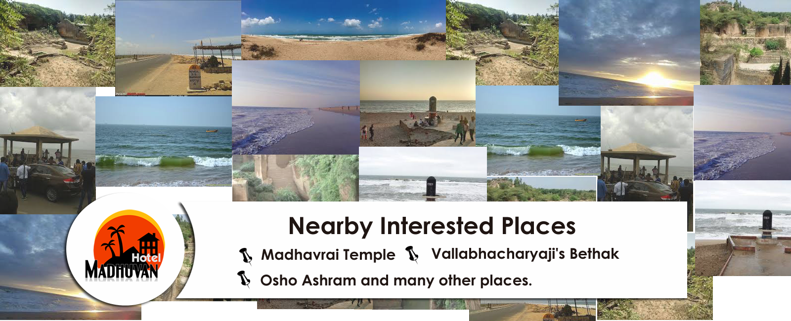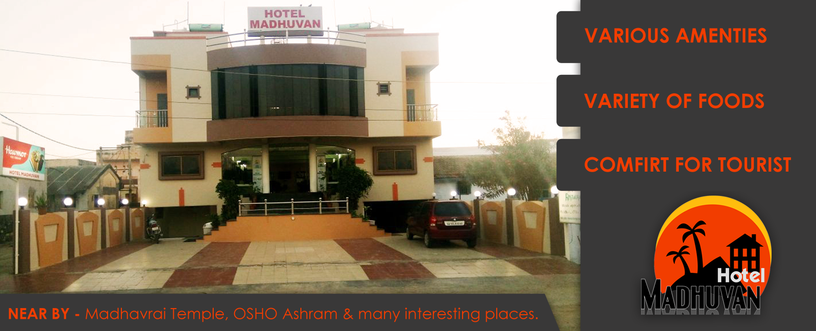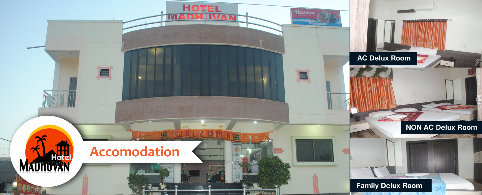 Hotel Madhuvan, Madhuvan ensures an ambience that makes one feel like home. The tastefully designed rooms are absolutely inviting while the various amenities make the stay convenient. Hotel Madhuvan is located at Madhavpur. Nearby Places of Interest are Madhavrai Temple, Vallabhacharyaji's Bethak and Osho Ashram (Swami Brahmavedantji). Madhavpur (Ghed) is a small but culturally significant village in state of Gujarat, India. It lies on the seashore, close to Porbandar. The Hotel is strategically located to suite the comfort and convenience of Tourists coming by Train, Private Vehicle, and other public transportation.